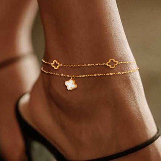 Lara | Charmante Enkelband met Klavertje Vier & Schelp Hanger voor Vakanties