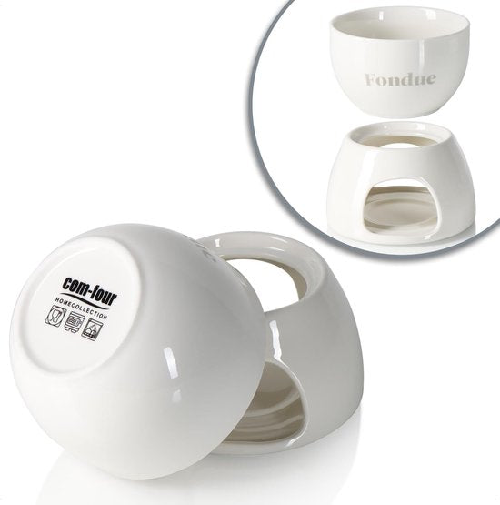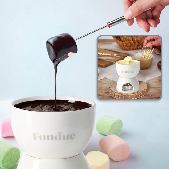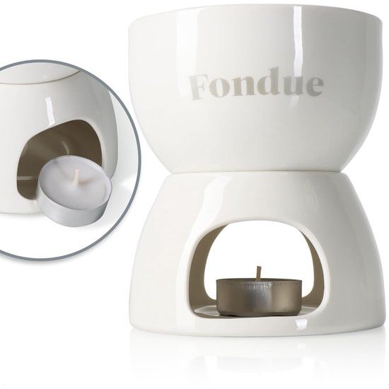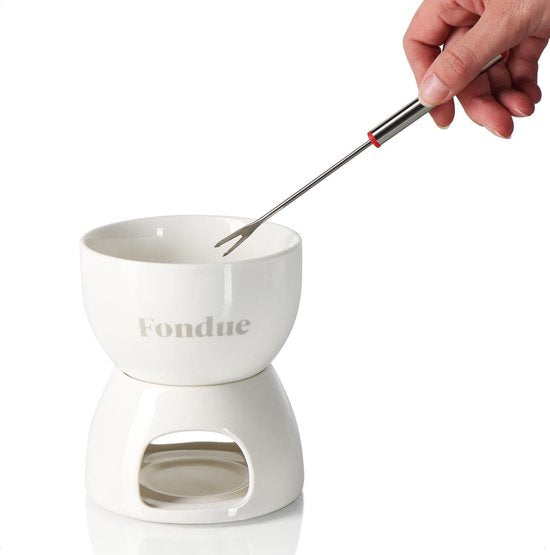 Voor speciale momenten: met de chocoladefondueset, goede chocolade en wat fruit smelten niet alleen harten bij kaarslicht! Voor speciale mensen: ideaal voor gezellige avonden met vrienden of familie met een heerlijke chocolade-, kaas- of vleesfondue. Voor lange tijd: de fondueset is gemaakt van hoogwaardig keramiek, waardoor de pot hittebestendig en gemakkelijk schoon te maken is. Voor meer genot: de vorken van de voedselveilige roestvrijstalen fonduevorken zijn perfect voor het prikken en vasthouden van fruit, vlees en marshmallows. Inhoud van de levering: 1 x pan, 1 x brander, 4 x vork. Materiaal: keramiek, roestvrij staal, kunststof. Totale afmetingen: ca. 13,5 x 11,5 cm (hoogte x diameter). Inhoud van de smeltpan: ca. 450 ml. Lengte van de v