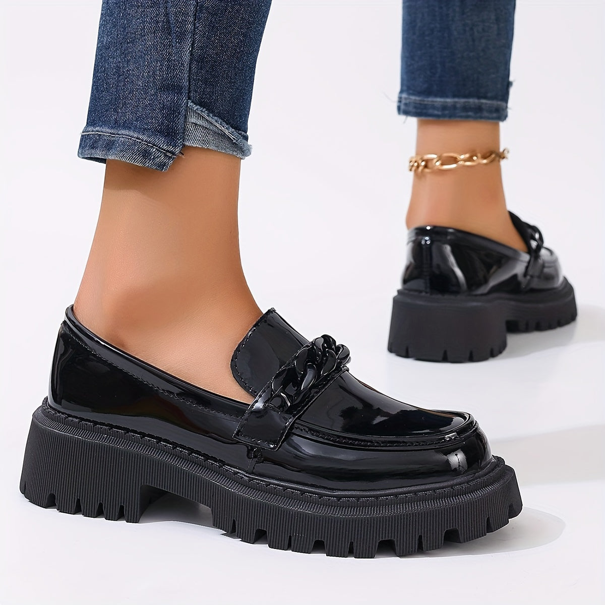 Deze stijlvolle loafers combineren mode en comfort met een stevige platformzool en chique kettingdecoratie. Het preppy design maakt ze ideaal voor zowel casual als formele gelegenheden, terwijl de solide kleur en comfortabele pasvorm ervoor zorgen dat je de hele dag stijlvol en op je gemak blijft.