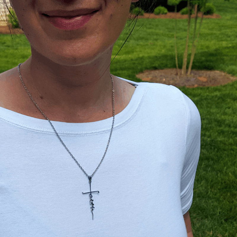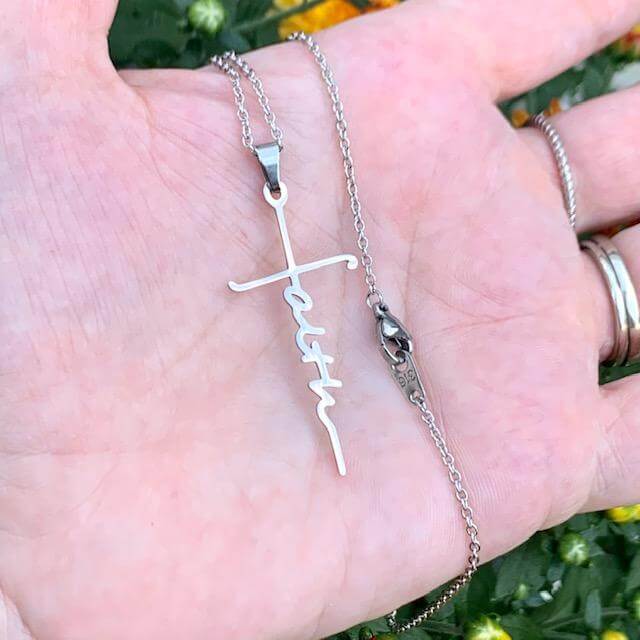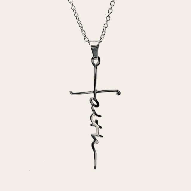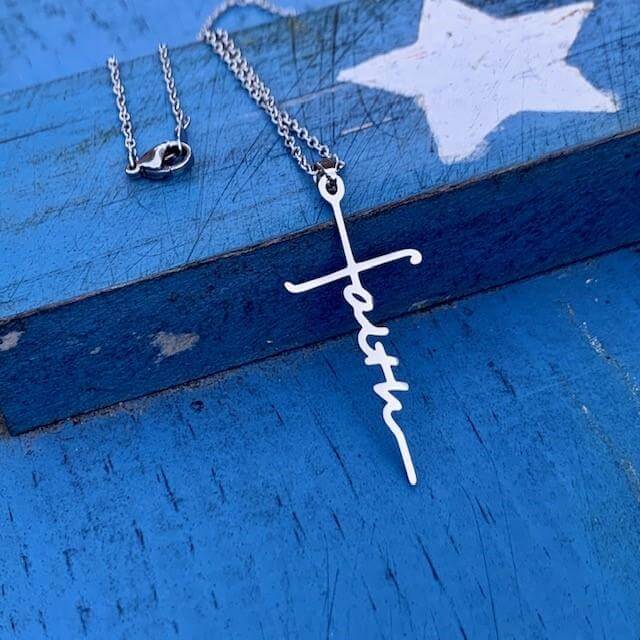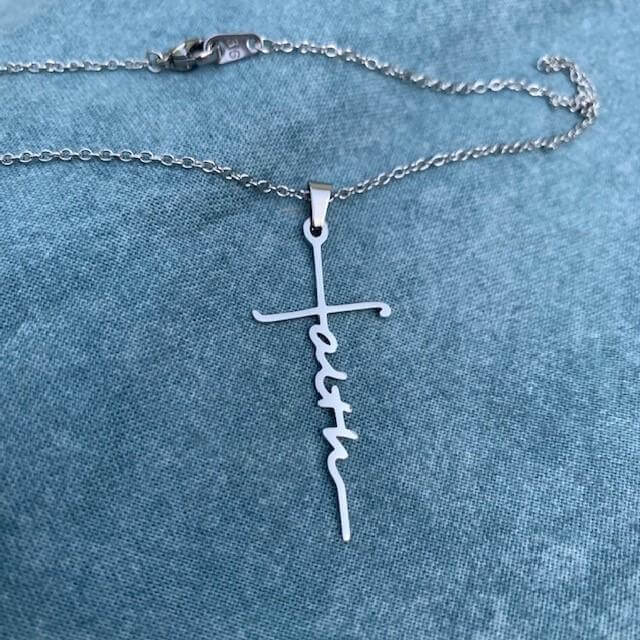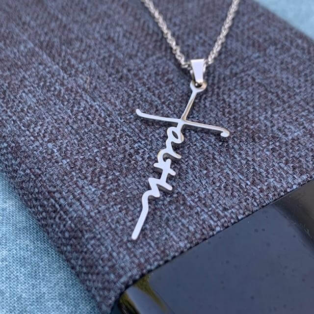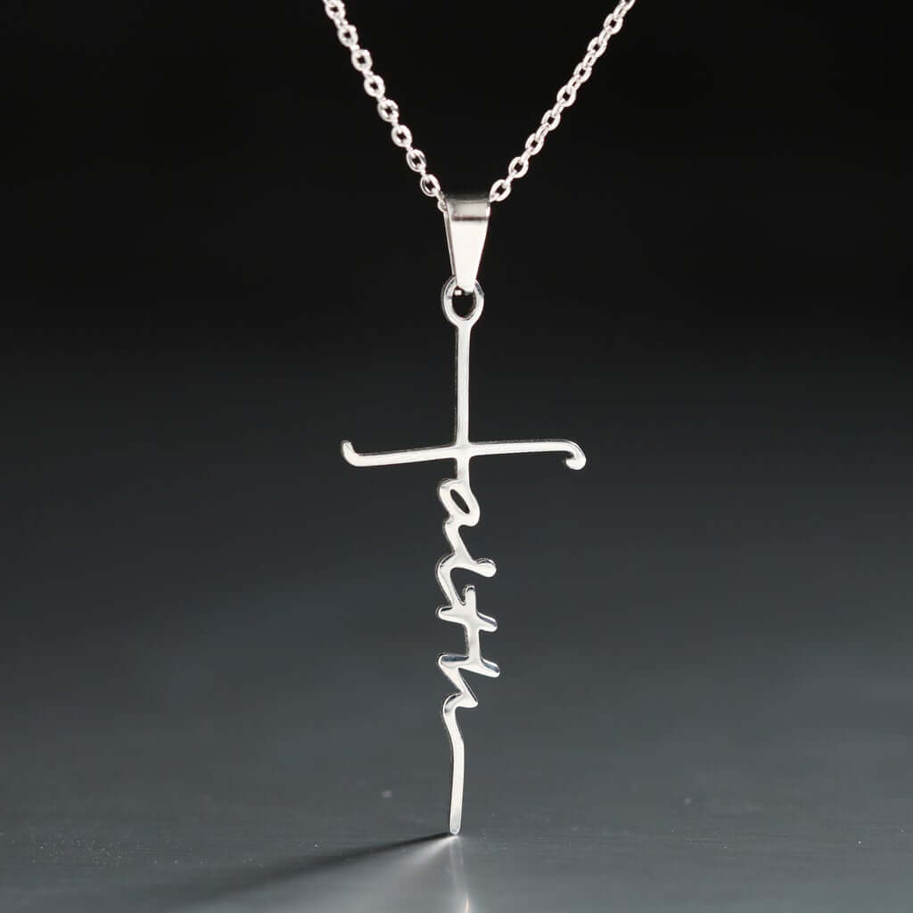Een prachtig, volledig gepolijst roestvrij stalen kruis met het woord FAITH verticaal geschreven in schrift aan een roestvrij stalen schakelketting.