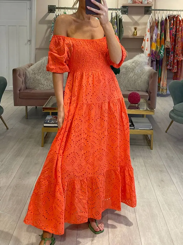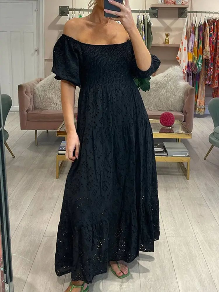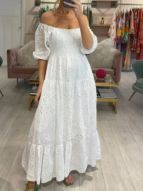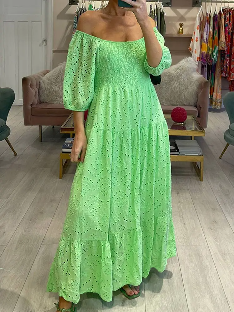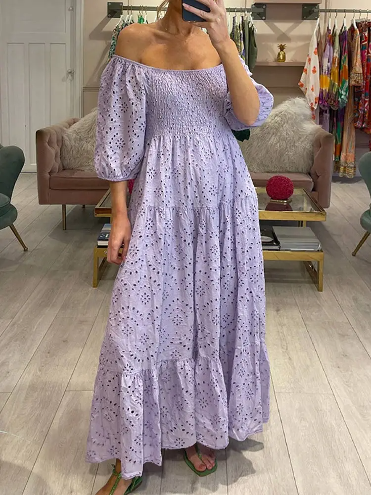 Stap in een wereld van tijdloze schoonheid met Lanté Jurk, de Elegante Off Shoulder Kant Maxi Jurk ontworpen om je zelfverzekerd en mooi te laten voelen. Met fijne kantborduursels en een flatuerende A-lijn silhouet, is deze jurk perfect voor elke zomergelegenheid, van etentjes aan het strand tot feestelijke vieringen. De off-shoulder halslijn voegt een vleugje verfijning toe, terwijl de korte mouwen de perfecte combinatie van stijl en comfort bieden.