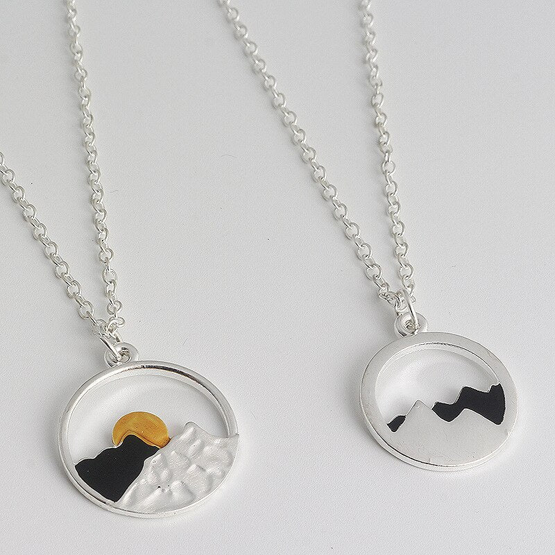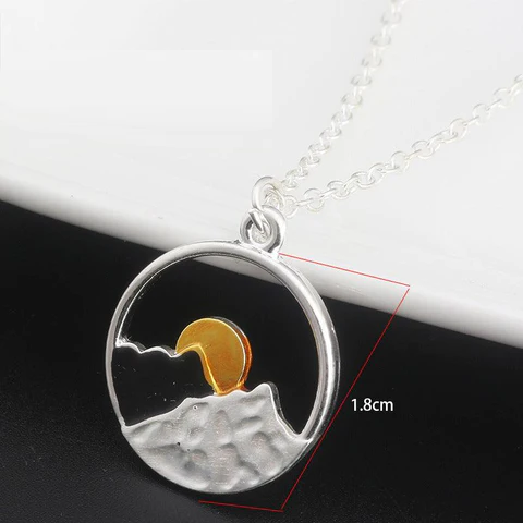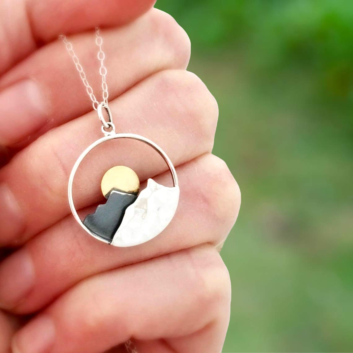 Lagen van sterling zilver met een bronzen zon (of volle maan) die tevoorschijn komt. Deze Nature Necklace is het perfecte cadeau voor de vrouw die van de natuur houdt, of ze nu skiet, wandelt, kampeert, of gewoon geniet van het uitzicht op de bergen.
