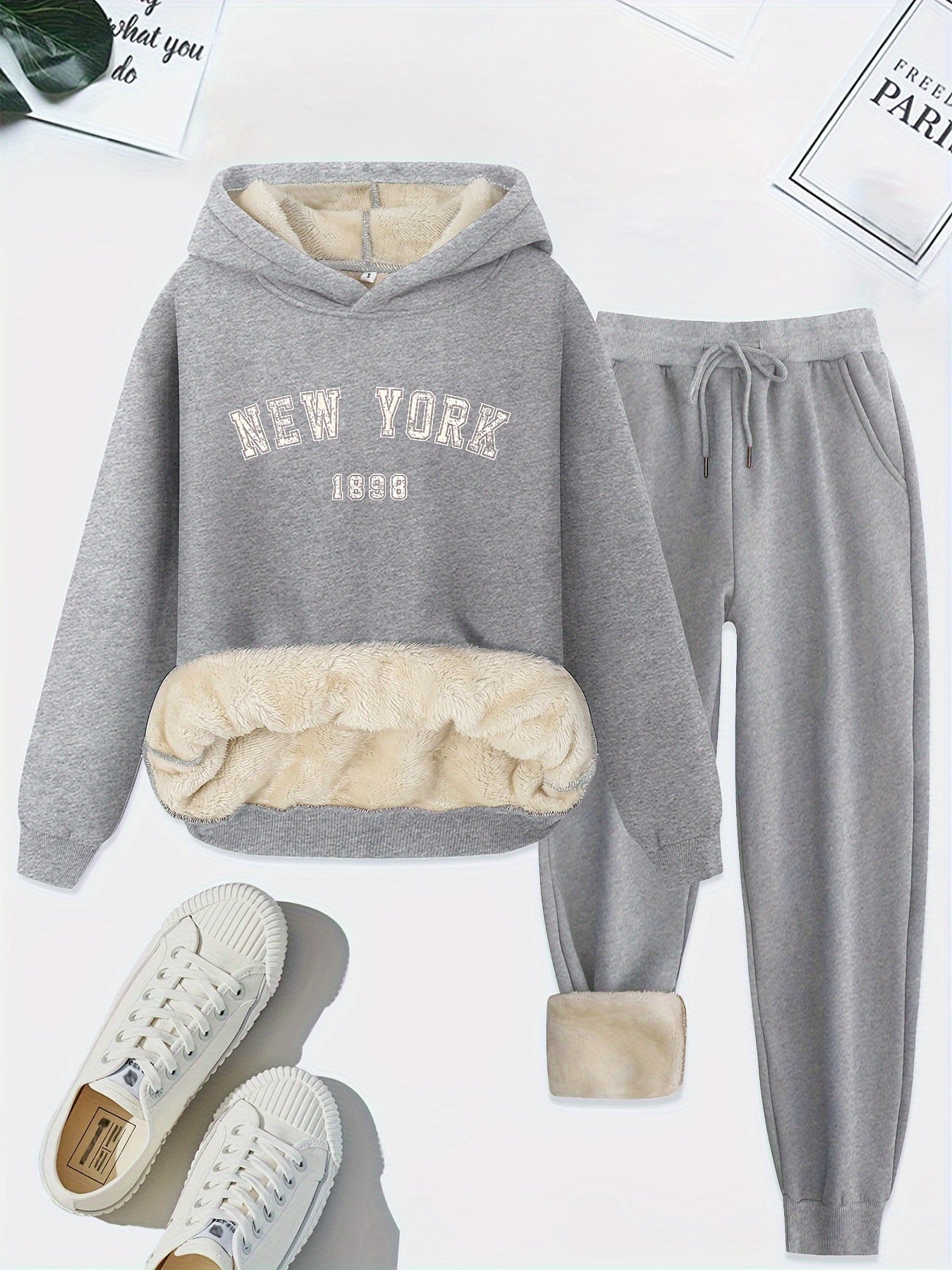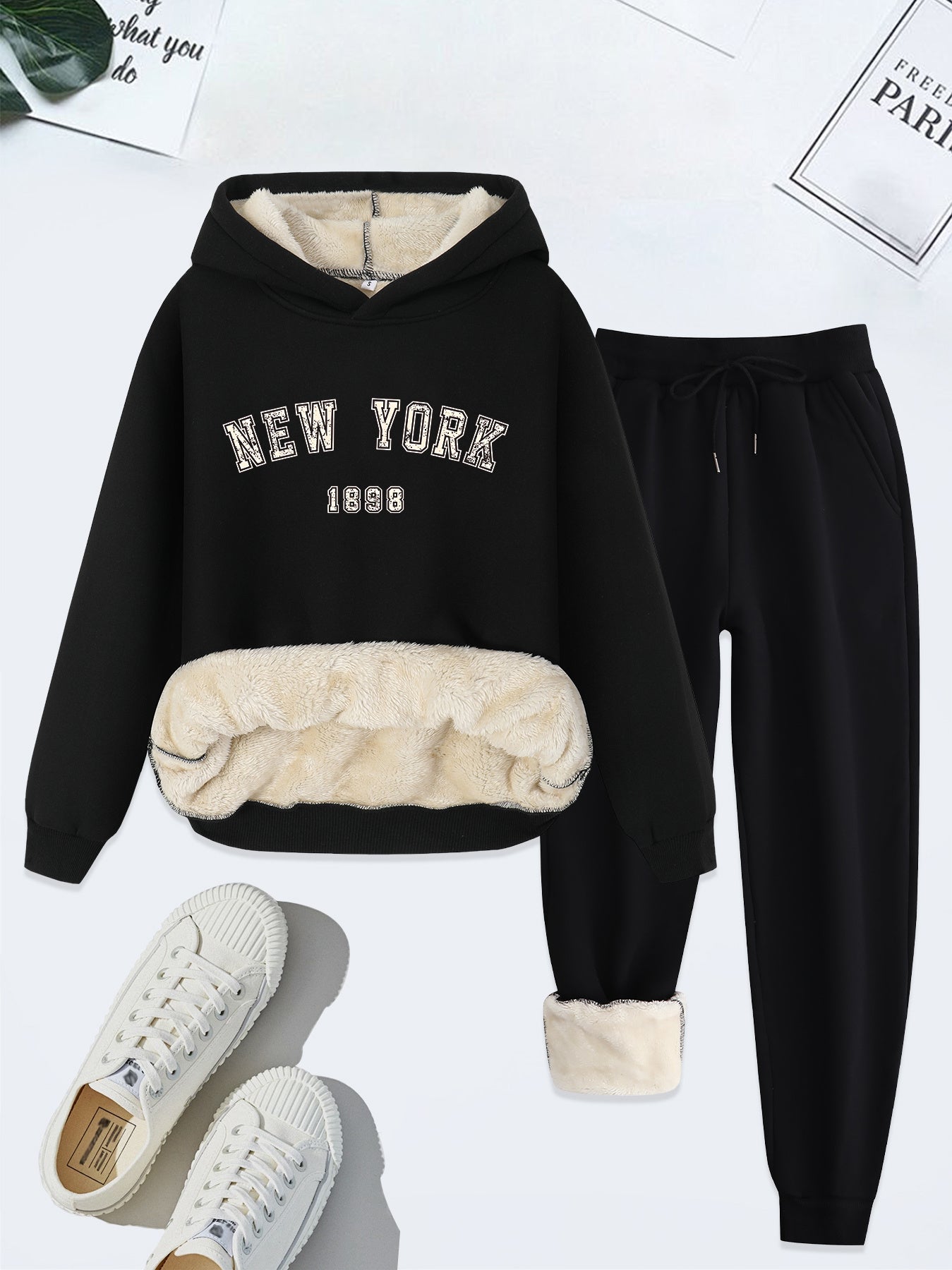 Ontdek nu de Mia | New York Print Warm Two-Piece Set, ideaal voor vrouwen die een casual en stijlvolle look willen tijdens de herfst en winter. Deze set bestaat uit een warme hoodie met lange mouwen en een bijpassende broek met trekkoord. Het New York-printdesign voegt een urban flair toe, perfect voor zowel ontspanning als casual uitjes.
