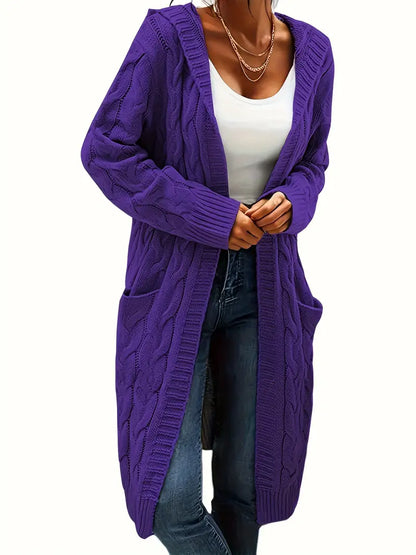 Ontdek nu de Emma | Solid Open Front Cable Knit Hooded Cardigan, perfect voor vrouwen die op zoek zijn naar een warme, casual look met een vleugje elegantie. Deze open-front cardigan met kabelgebreide textuur en capuchon biedt extra warmte voor de koelere dagen, terwijl de lange mouwen en twee voorzakken het praktisch en veelzijdig maken. Ideaal voor een comfortabele en modieuze uitstraling in de herfst en winter.